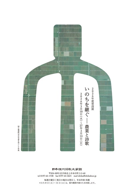 タイトル いのちを継ぐ―農業と詩歌 会期 2026年3月10日(火)~2027年3月14日(日) 9:00~17:00 場所 2階 展示室 入場料 無料 主催 日本現代詩歌文学館 図録 1,100円(図録の購入は こちら ※準備中) ...