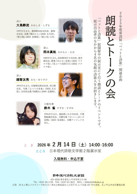 出演:大島静流(詩人)、岡本真帆(歌人)、越智友亮(俳人)、鈴木雀(川柳作家)/日時:2026年2月14日(土)14:00~16:00/会場:日本現代詩歌文学館 2階展示室/入場無料、申込不要